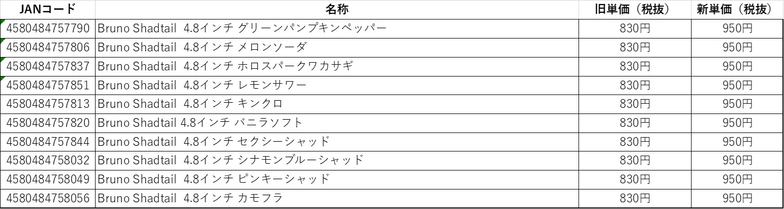 BRUNO SHADTAIL 4.8インチ 上代変更のお知らせ