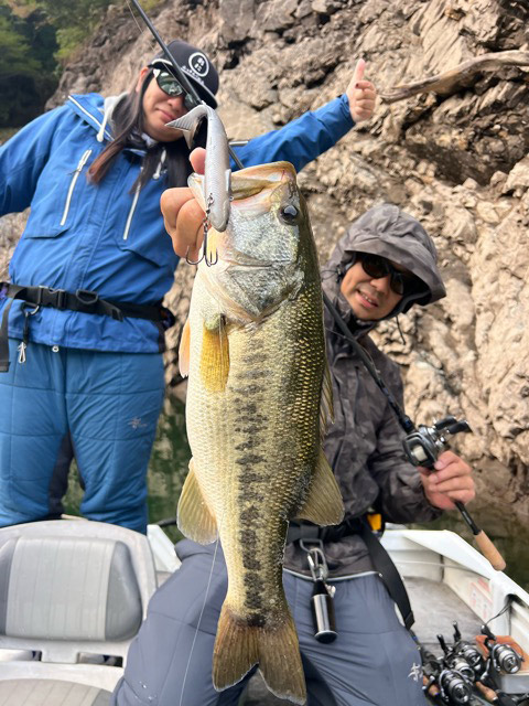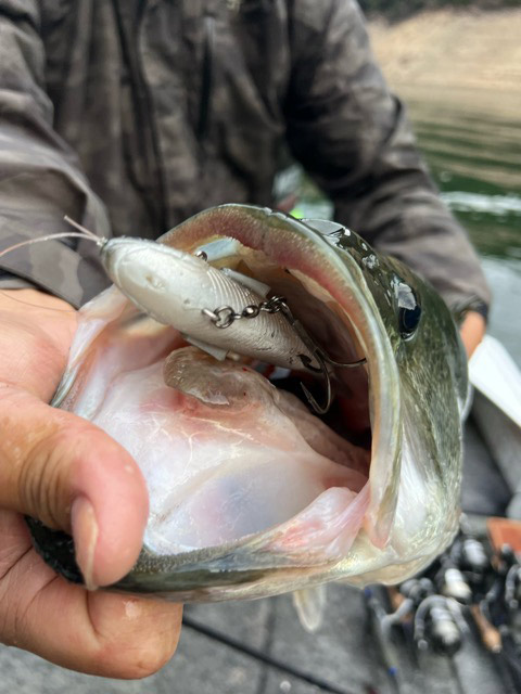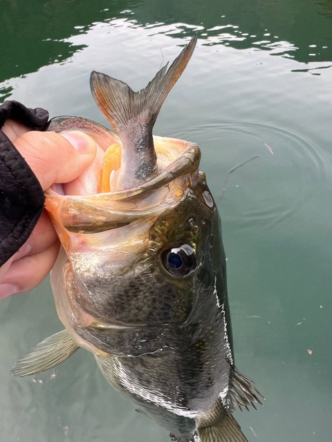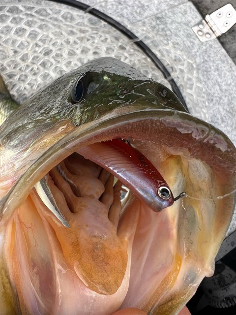 160サイズが池原のデカバスを狂わせる1番しっくりくるサイズで、バスの口の中から160サイズのアマゴが登場!