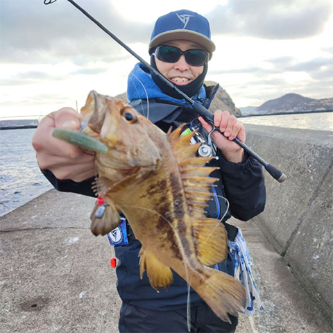 次いで同行の仲間S氏が 👉ギーラカンス3インチで51cmの良型アイナメをヒット。ギーラカンスはロックフィッシングでも強ぇ~ワーム。