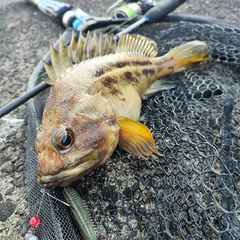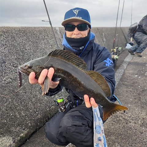 少しずつシャロー側へ移動しながら打っていると、冬のアイナメらしいグインとしたアタリを合わせ、コンディションの良いアイナメがヒット。