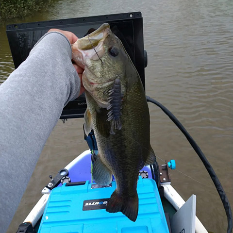 使っているフットボールジグは房総フィールドという事もあって少しボリュームが抑えられてるコンパクトなフットボールジグを選択、これがトラスター3インチとサイズ感がマッチ!これを岩盤や岬の先端〜ブレイクにキャスト、トラスターのトリプルテールのアクションでフォールバイトを誘い、着底してからはジグストで誘います、ライブスコープを見ているとジグスト最中にバスが舟の手前まで追ってくることもしばしばなので最後まで丁寧にジグスト出来るかで釣果も変わります。
